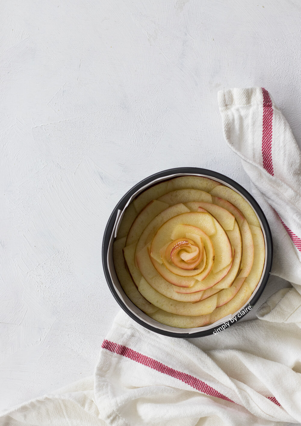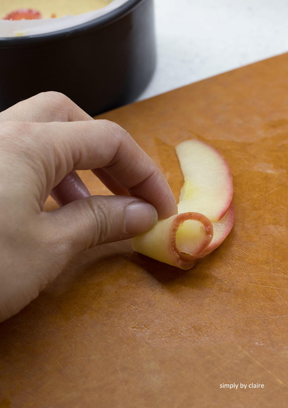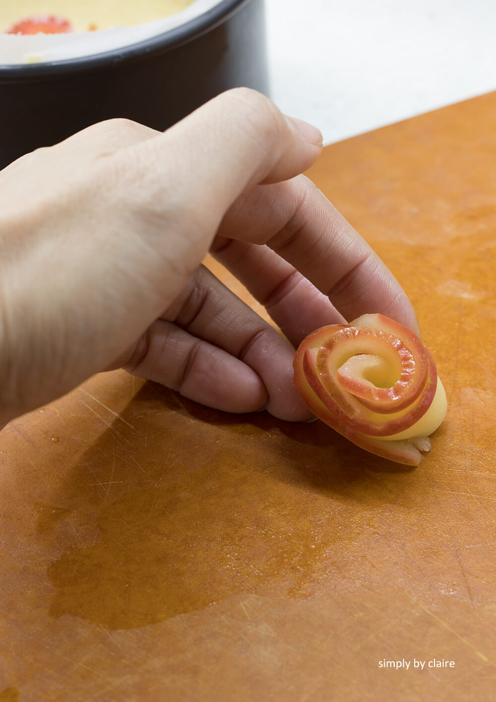 7. 排蘋果花 : 蘋果片從最外圈開始一圈排完再往中心裡面放,蘋果片平平的放上去就好,不需壓進麵糊中。每一片放下去時,要跟之前一片重疊1/3,第2圈的蘋果也要跟第1圈重疊,以此類推。最中心的花蕊,依烤模的大小,可用4-6片蘋果片疊放後,捲起來即可。