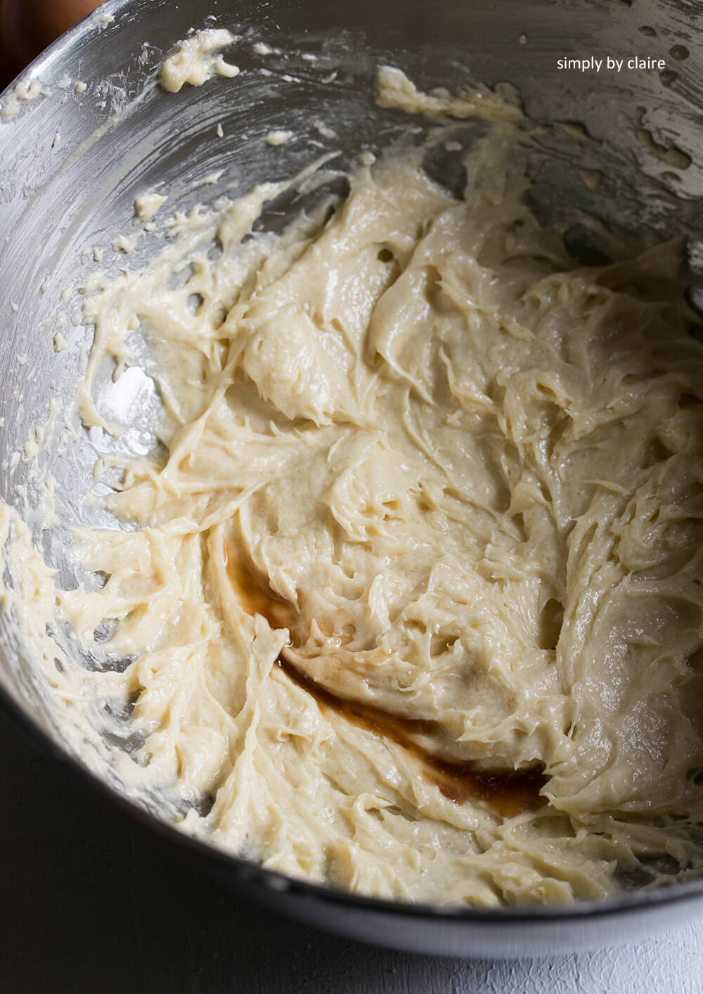 2. 奶油軟化後,先單獨把奶油打發到有little tails的程度,再分2-3次加入糖,打發到奶油顏色變淡、變膨鬆、呈乳霜狀。