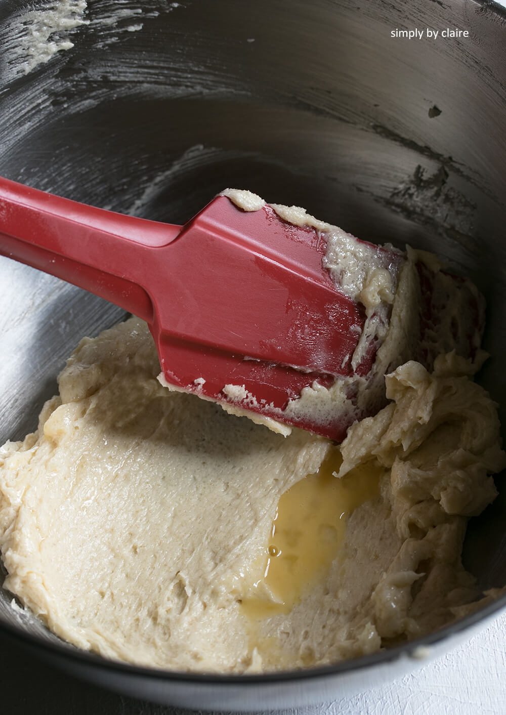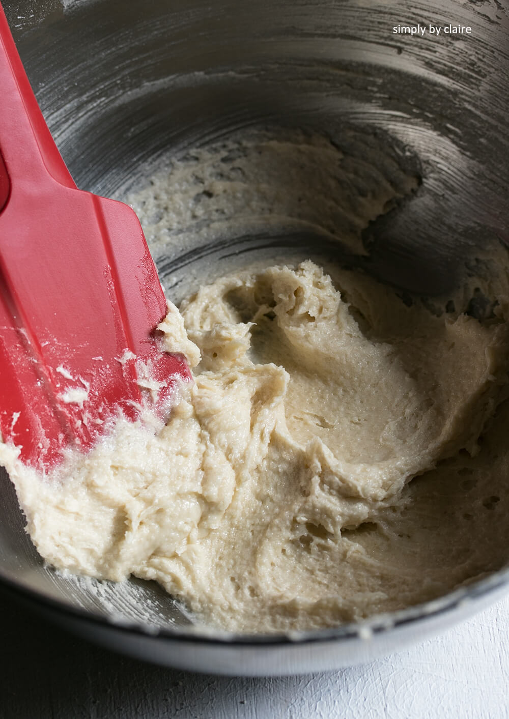 4. 把打蛋器換成矽膠刮刀,準備輪流加入乾料、乳製品。乾料分四次加入,液體 (乳製品) 分三次加入,而順序是1/4乾料 → 1/3乳製品 →1/4乾料 → 1/3乳製品 →1/4乾料→最後1/3乳製品 → 最後1/4乾料。每次加入時,都要用切拌的方式持續輕柔的攪拌,直到材料混合均勻,看不到粉粒或液體。最後一次材料投入後,除了混拌到看不見粉類,要繼續攪拌幾次,直到整體麵糊呈現光澤有彈性的狀態。
