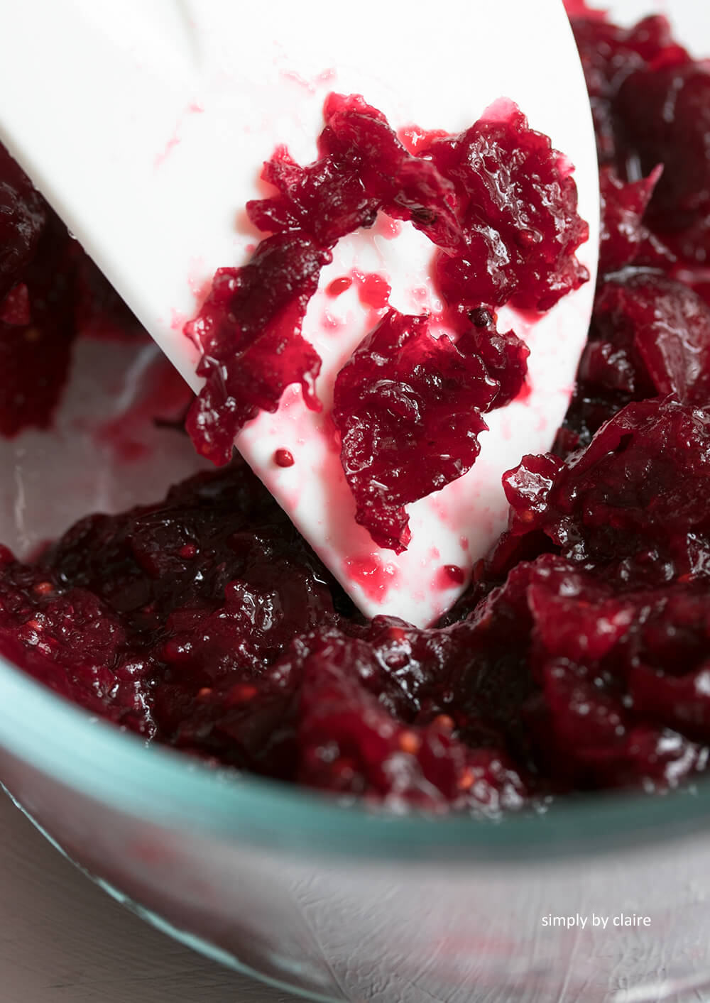 瀝乾後以調理機 (或刀子) 將蔓越莓稍微切成小塊,避免造成蛋糕體有大空洞,導致口感不佳。