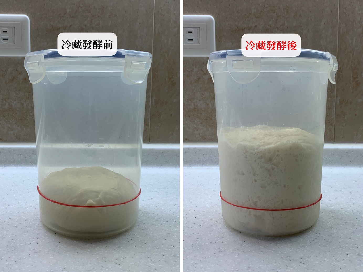 - 第一次發酵也可以室溫發酵,憑個人喜好。我自己偏好冷藏發酵的方式,尤其是夏天,麵團會黏得讓你懷疑食譜懷疑人生,但是用冷藏發酵後續的操作輕鬆很多。