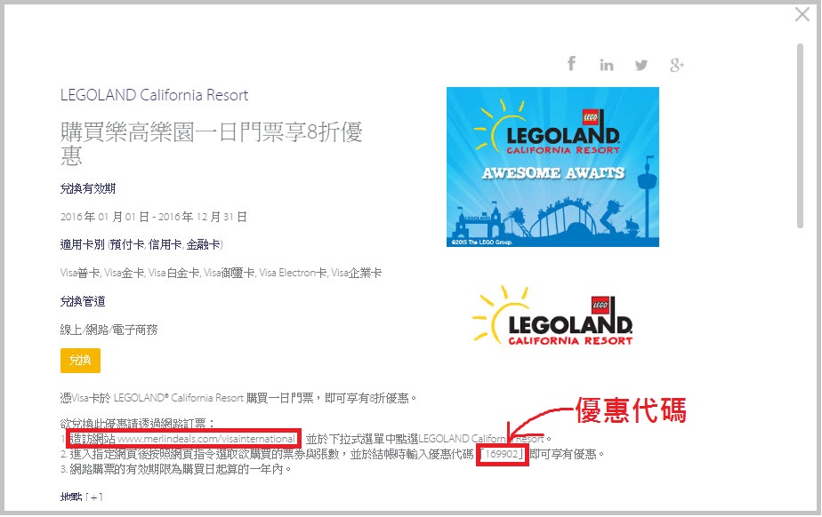 1. 進入VISA的網站,點進去找到Legoland門票的頁面。頁面上有Florida也有California的Legoland,點選時愛恣以~