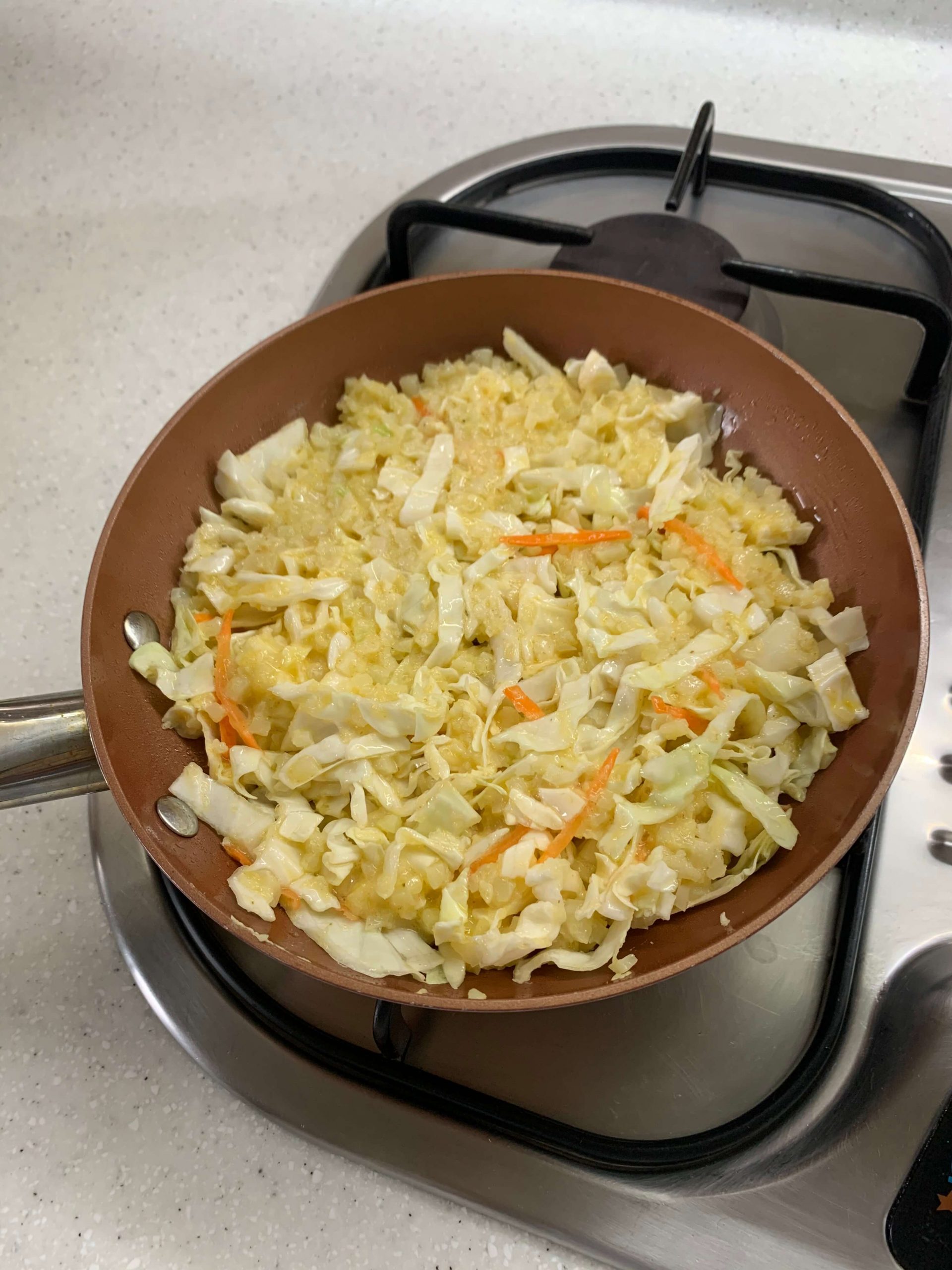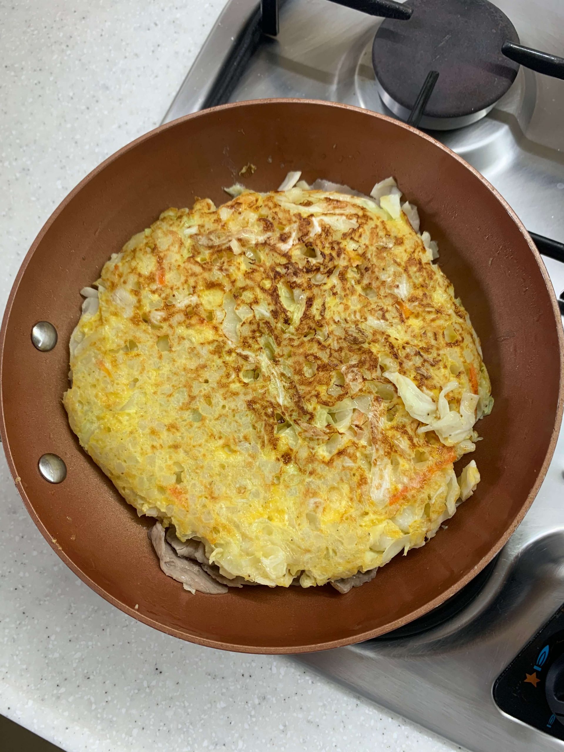 - 預熱平底鍋,加入一點油,把混合好的食材放進平底鍋煎。