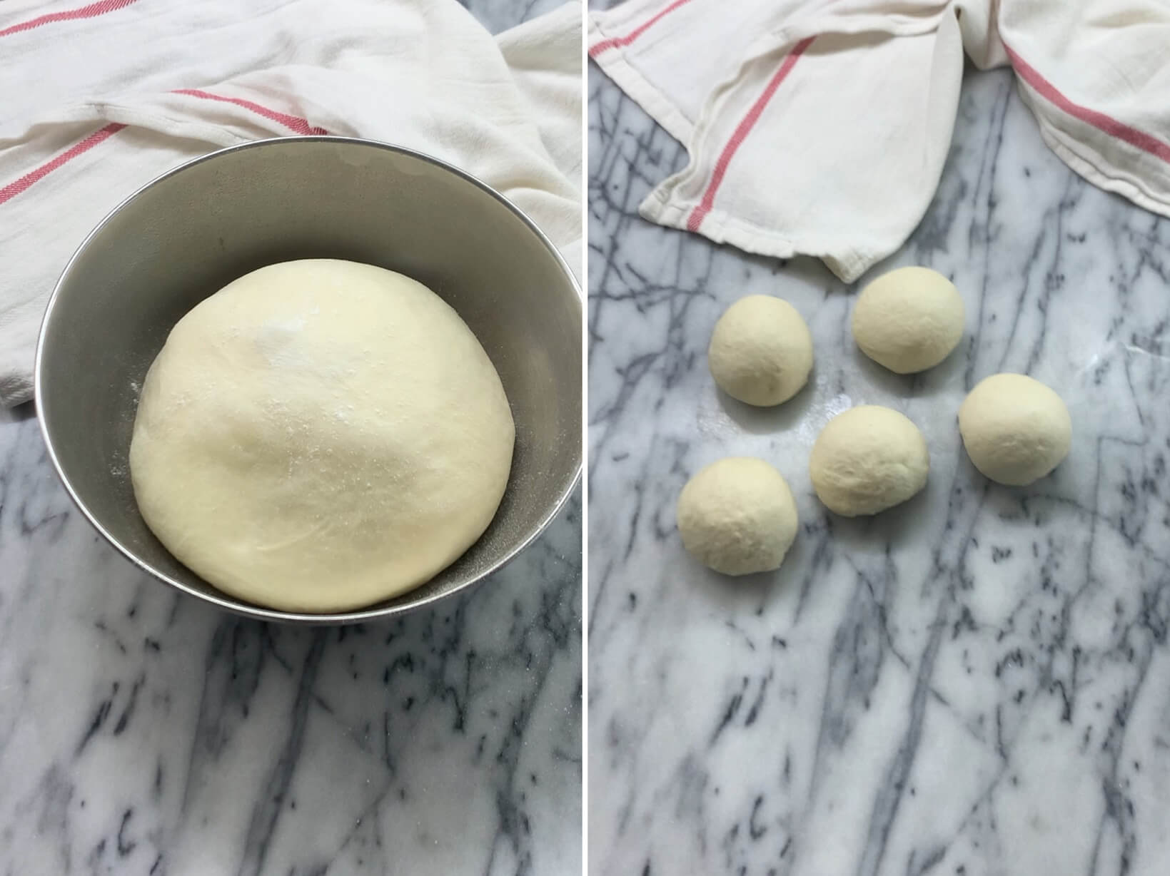 - 回溫、分割與鬆弛 : 取出冷藏發酵完成的麵團,輕拍排氣,分切成5等分,滾圓,蓋上濕布巾靜置鬆弛10∼15分鐘。
