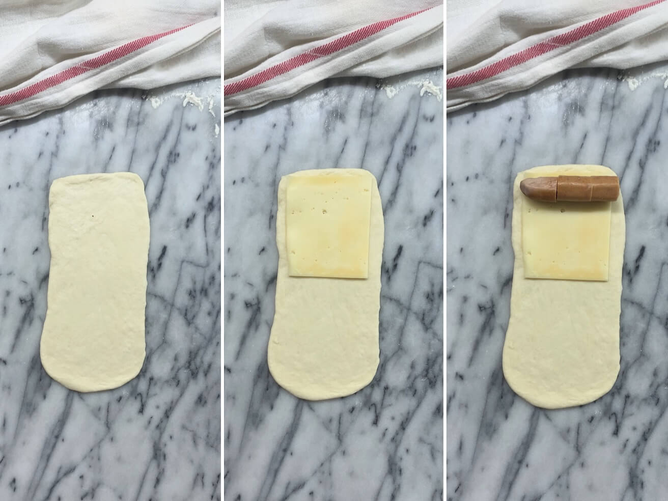 - 整型 : 輕拍小麵團排氣,桿平成12×22cm的長方形麵片,德式香腸跟起司放在接近頂端的地方。