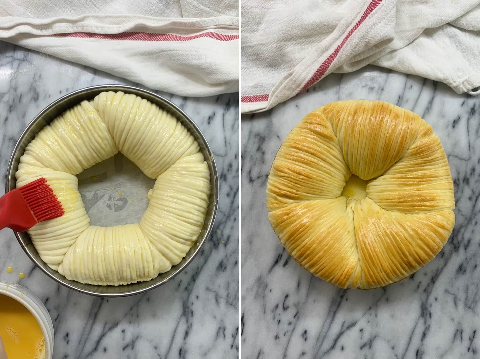 - 第二次發酵 : 把做好的5個麵片捲放進烤盤中排好,發酵到1.5倍大,接近發酵完成時開始預熱烤箱。發酵完成,表面刷上牛奶。