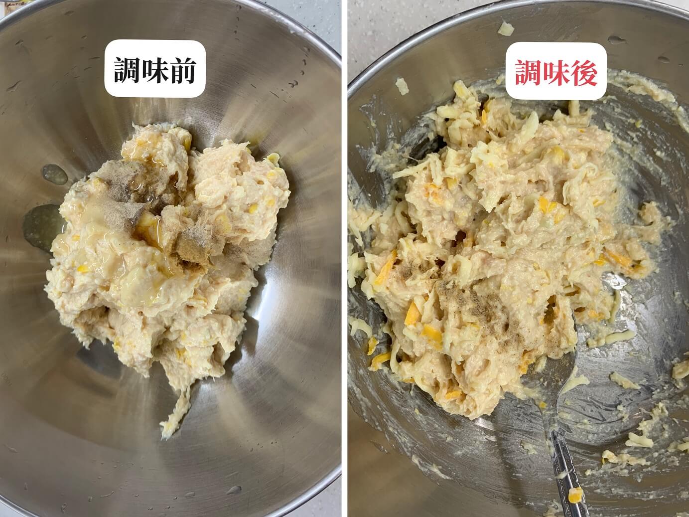 - 將上一步驟的雞肉豆腐泥倒入調理盆中,加入調味料,攪拌均勻。(想試味道可以用湯匙挖一小球,放進鍋中煎熟,看看需不需要調整)