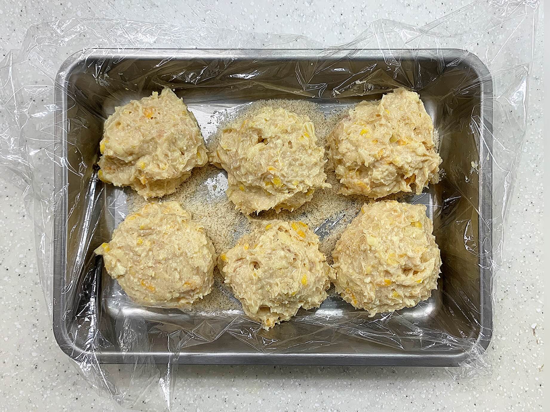 - 如果沒有要馬上吃,可以一個一個分開放在保鮮膜上,進冰箱冷凍定型。(我的雞肉豆腐漢堡排兩面都有灑一些洋車前子粉,可以省略)