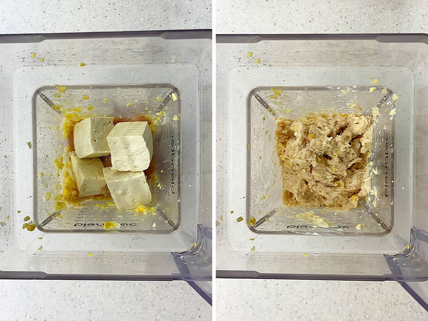 - 把玉米粒、雞肉跟板豆腐一起放進調理機中攪拌,如果喜歡有點吃到雞肉口感的,可以先切一小部分雞胸起來、先不要放進調理機,等第一次攪打完畢後,再放進去調理機中稍微調理一下,這樣就會有兩種口感。