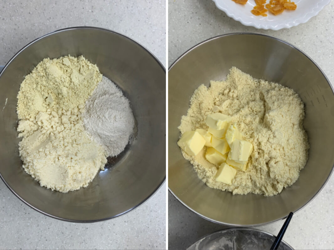 - 杏仁粉、生黃豆粉、糖粉三者一起混合過篩。將軟化的奶油塊加入粉類中。(要加鹹蛋黃碎粒的可以這時候加進去)