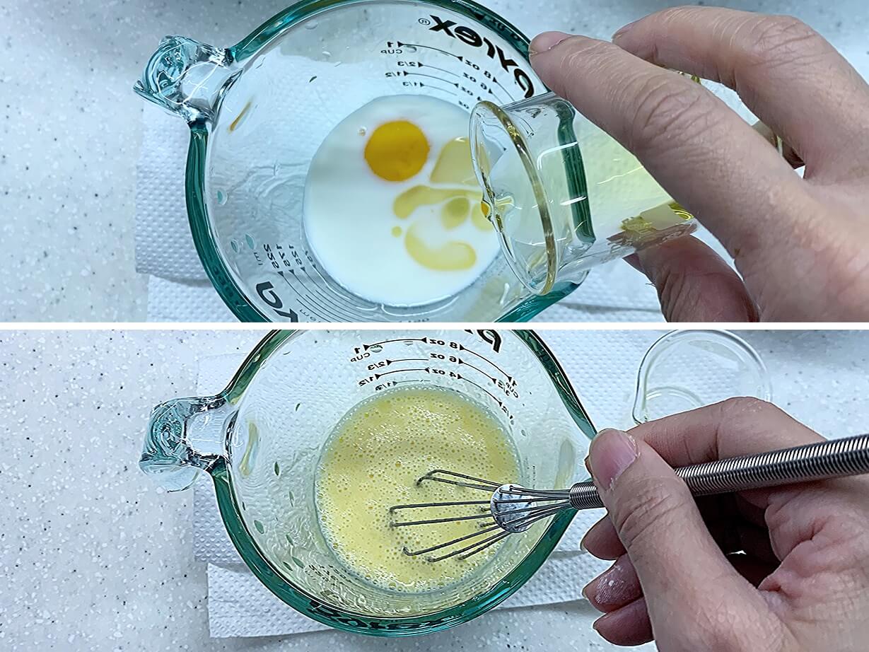 - 製作蛋黃奶液 : 把植物油跟牛奶加入裝有蛋黃的碗中,攪拌至完全融合。