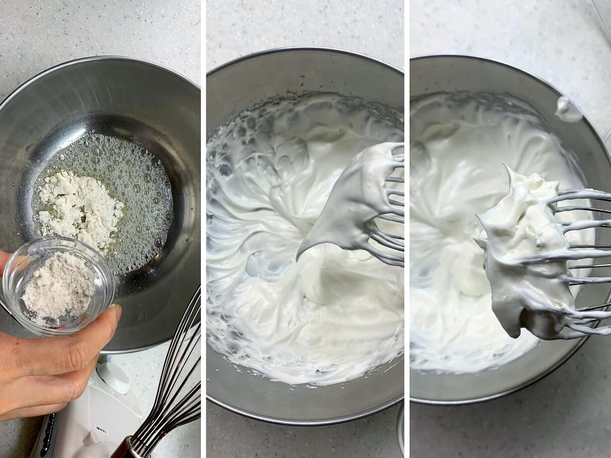 - 製作蛋白霜 : 電動打蛋器開低速,先斷開蛋白的濃稠狀連結,打成白色粗泡且看不見液體後,準備分2-3次加入糖。電動打蛋器轉成高速打發至蛋白體積變大,直至蛋白霜呈現挺立狀態後 (乾性發泡),最後以電動打電器轉成低速攪打10秒。
