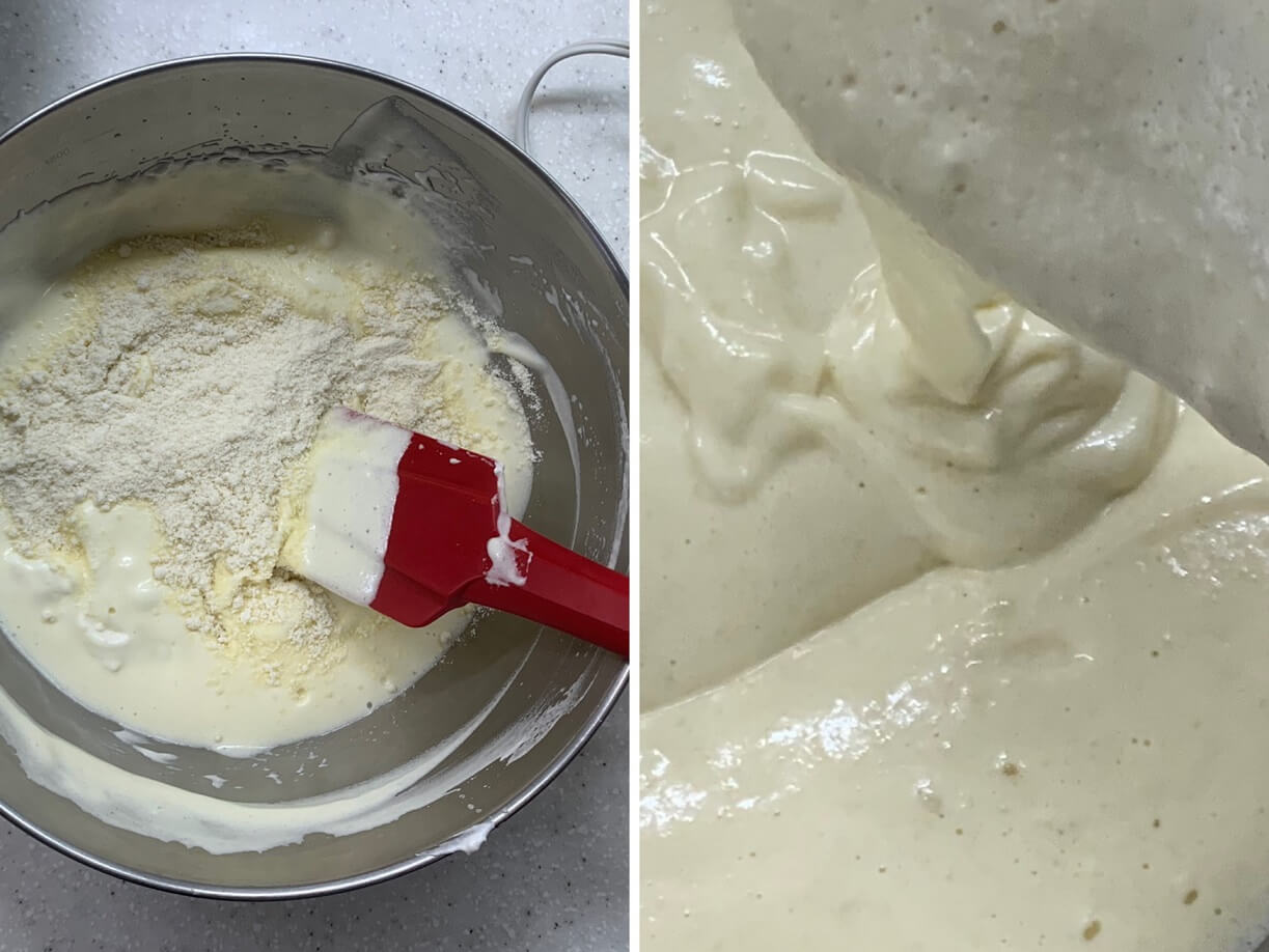 特別注意盆底的材料要確實翻攪上來,快速混合到看不見白色的蛋白霜、也看不見粉類為止。