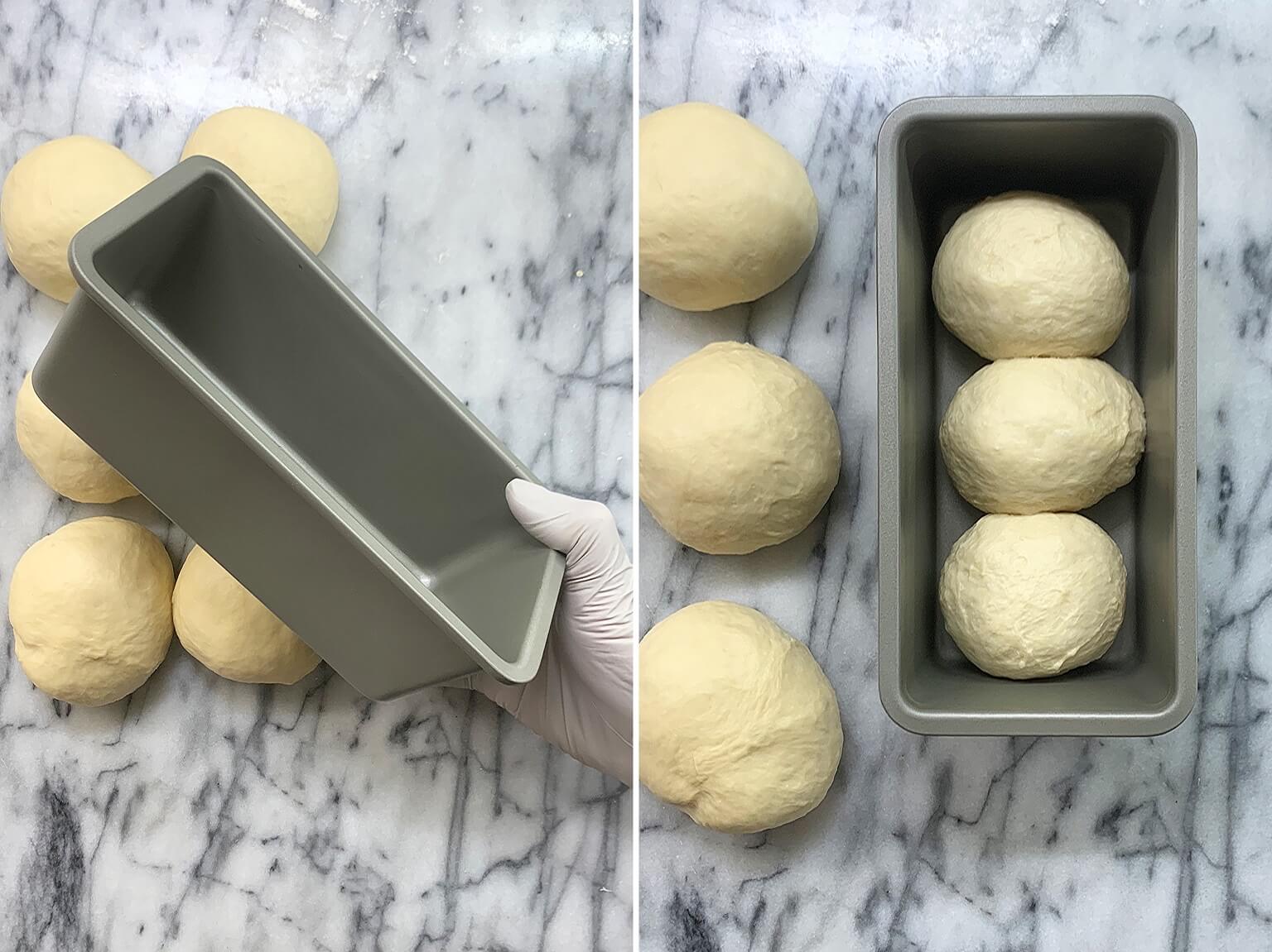 - 滾圓完成後,放入模具中(原食譜是1模放2個,我改成1模放3個)。