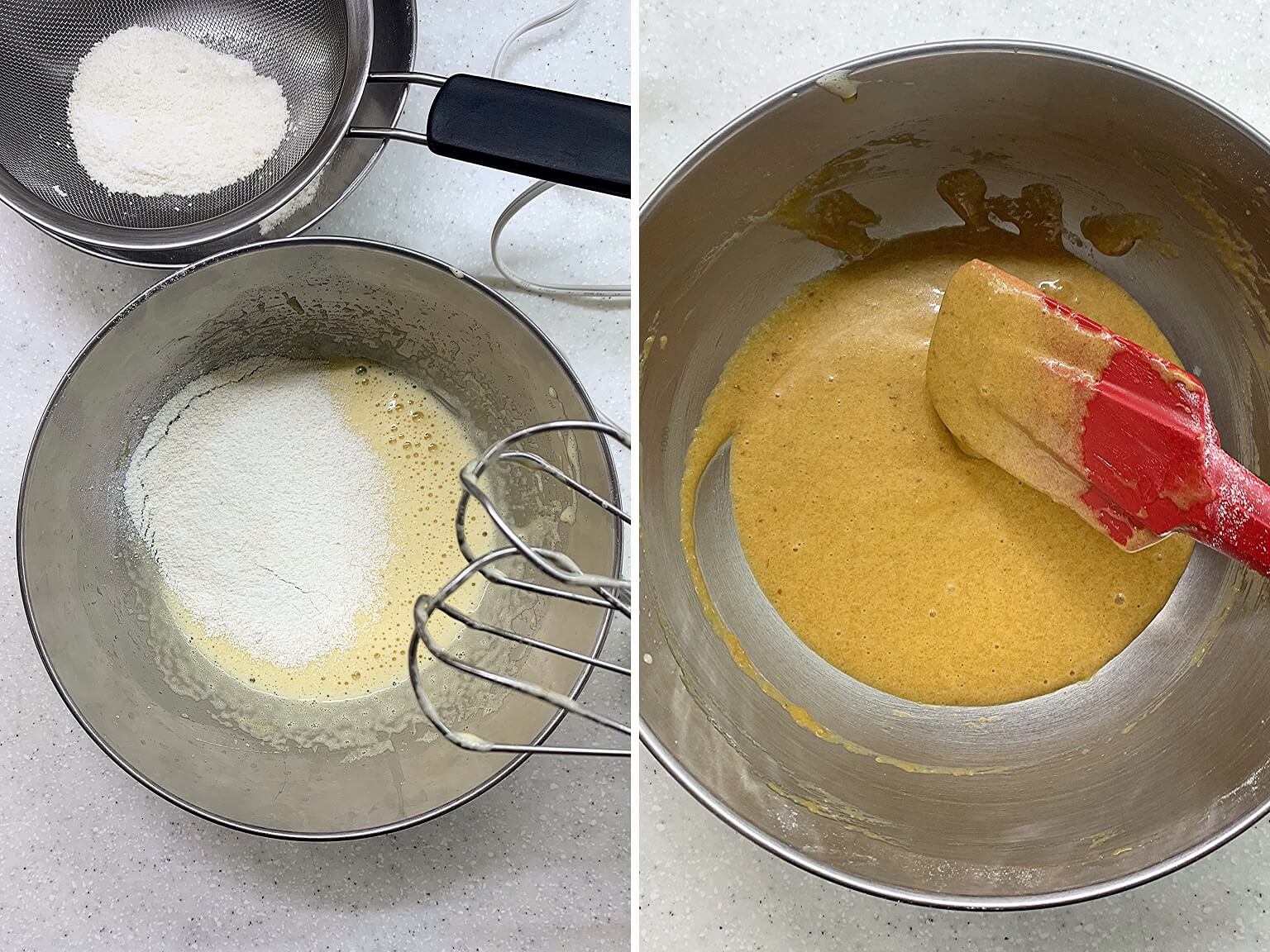 - 將粉類分2-3次篩入上一步驟的蛋糊中,攪拌均勻後,再把步驟2的蓮花奶油醬分次加進麵糊中,攪拌均勻,至完全融合。