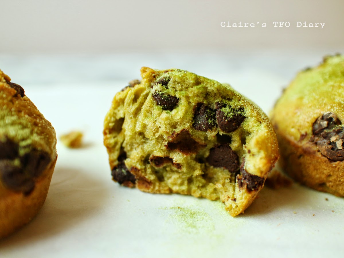 為了作個不同顏色的馬芬,這次用了抹茶粉。只是我這次的麵糊量太少,所以只有加到3/4滿,而且烤模進烤箱時沒有平放,所以成品頂部不如以前澎而且歪歪的,但外酥內軟的味道還是不變的。