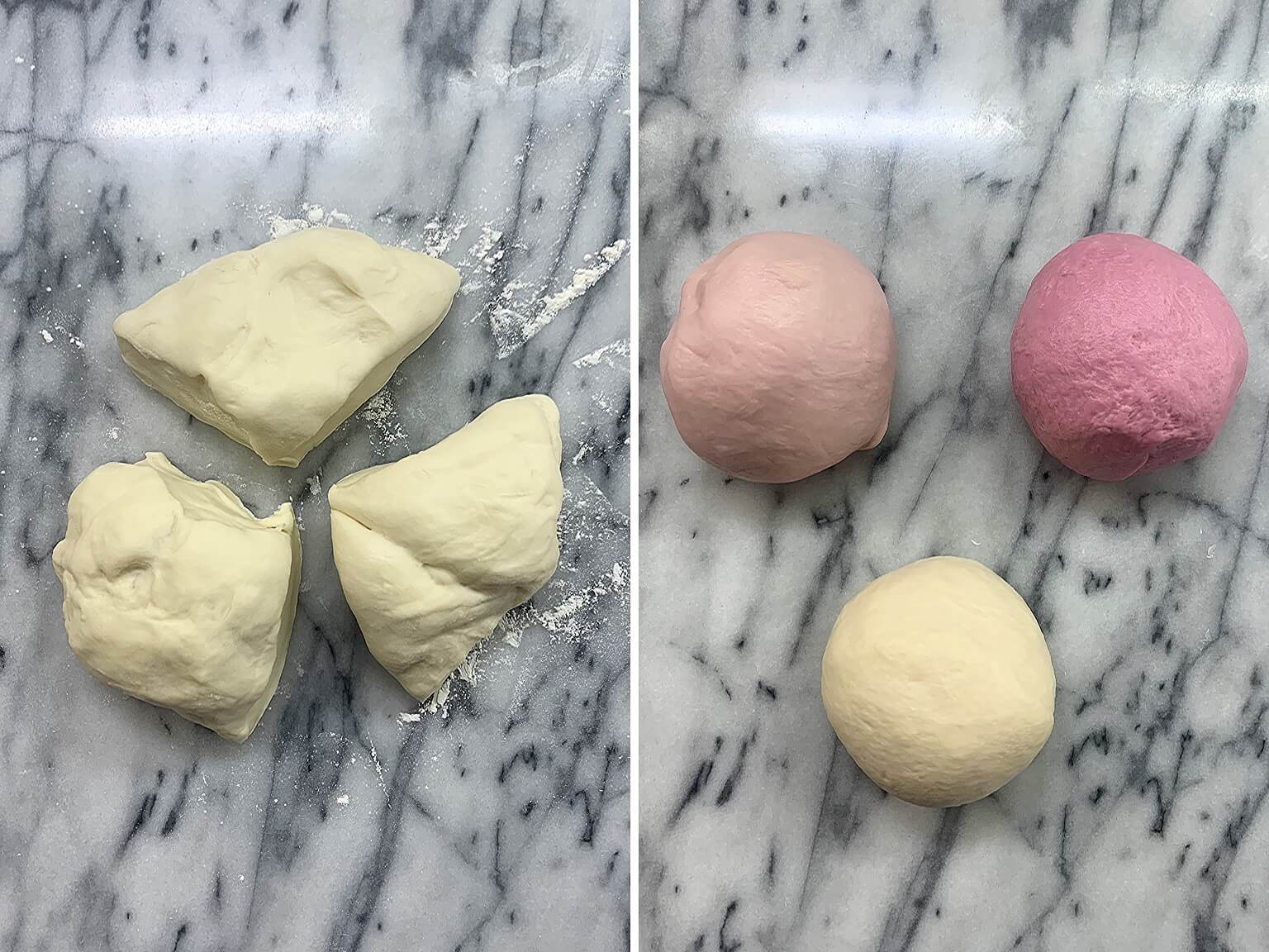 - 麵團調色 : 麵團打好後分切成3等分,分別加入色粉,用手揉麵團,調成深到淺的粉紫、粉紅、白色麵團。