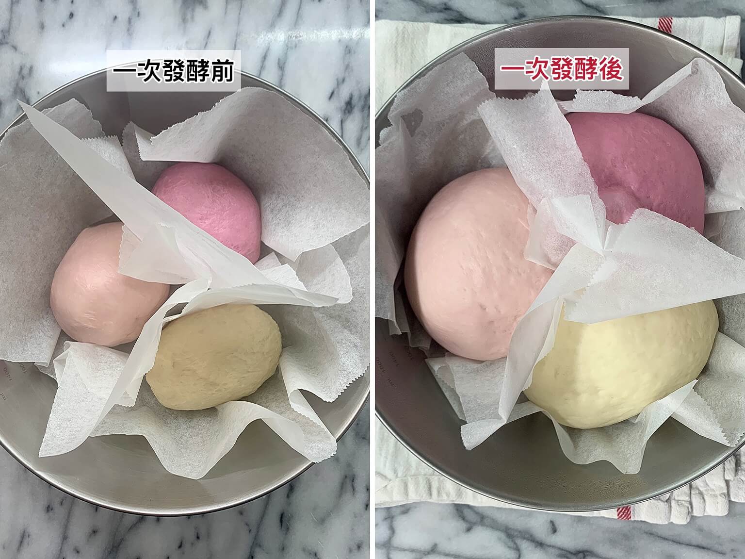 - 第一次發酵 (冷藏發酵) : 三色麵團整成圓形後放進密封盒中,送進冰箱冷藏發酵8-12小時,麵團大約會發酵2倍大以上。(室溫發酵也可以)