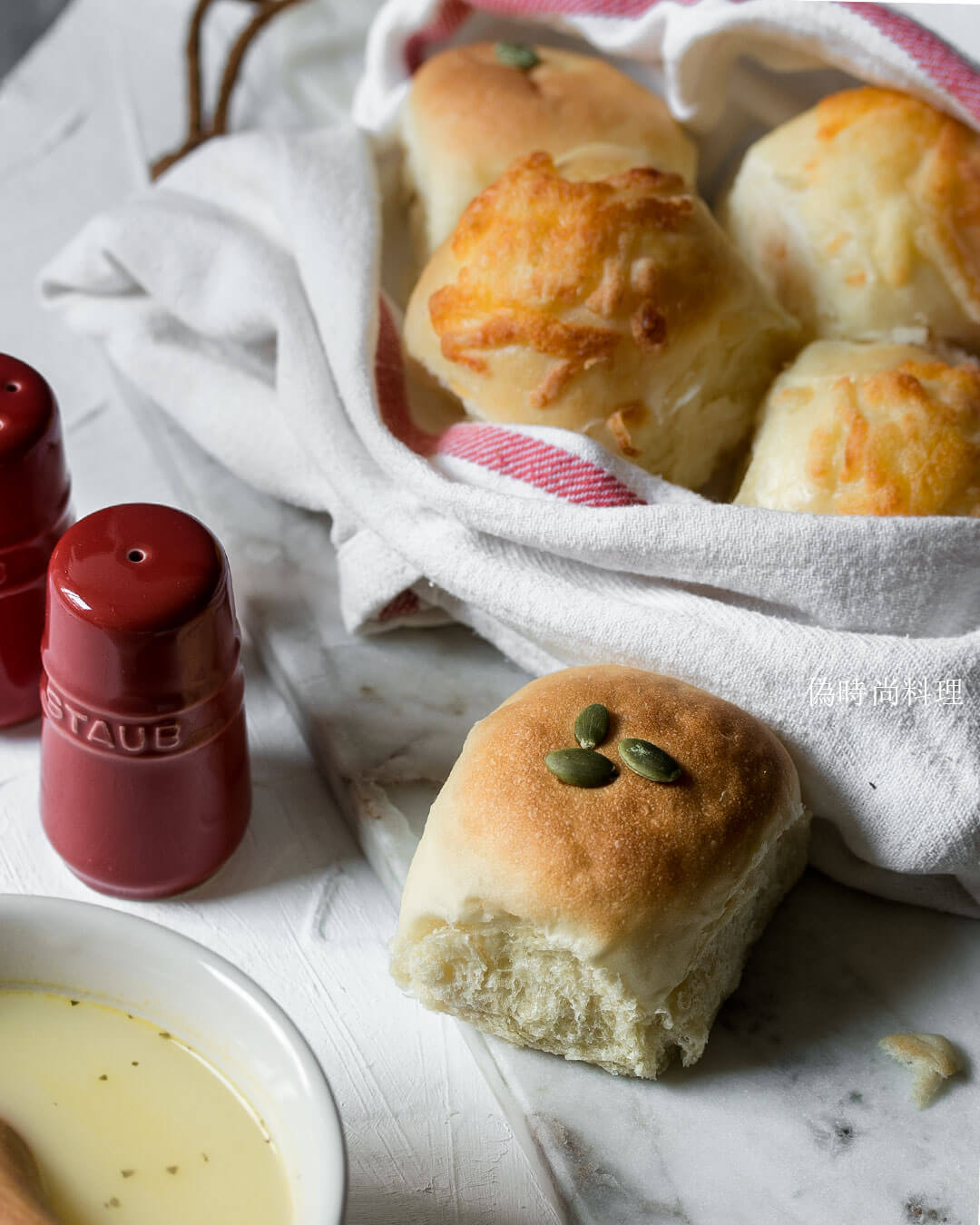 食譜是參考辣媽Shania的台式麵包麵團。奶酥餐包 (上面有綠色南瓜籽的) 比較大,一個是40g的麵團,起司餐包則是36g左右。但是其實也是可以都一樣大的啦😅😅