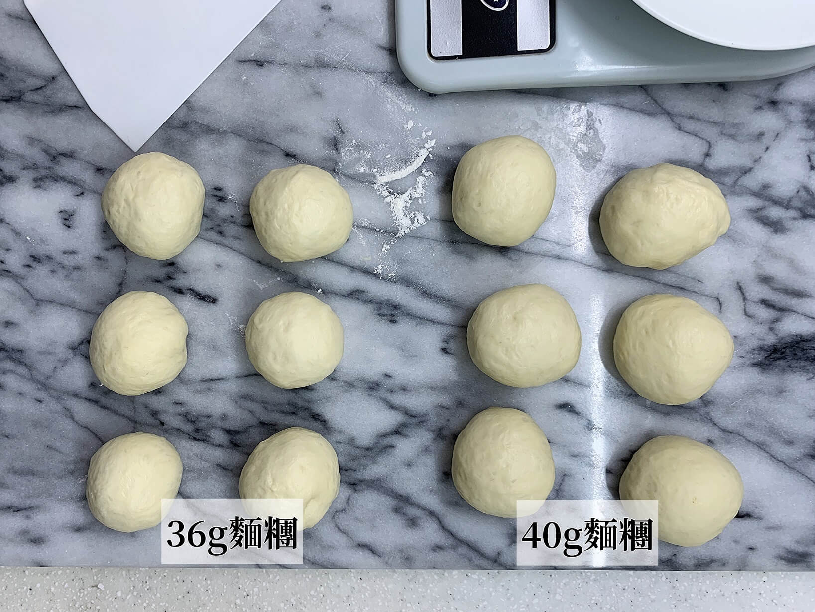 - 鬆弛&分割:從冰箱取出冷藏發酵完成的麵糰,待其稍微回溫,輕拍排出空氣,先秤總重約是460-470g,分切成奶酥包240g跟起司包220-230g,奶酥包再分切為6個小麵團每個40g重,起司包也分切成每6個小麵糰約是36g左右,每個小麵糰滾圓整成圓球型,蓋上濕布或保鮮膜,靜置鬆弛10-15分鐘。