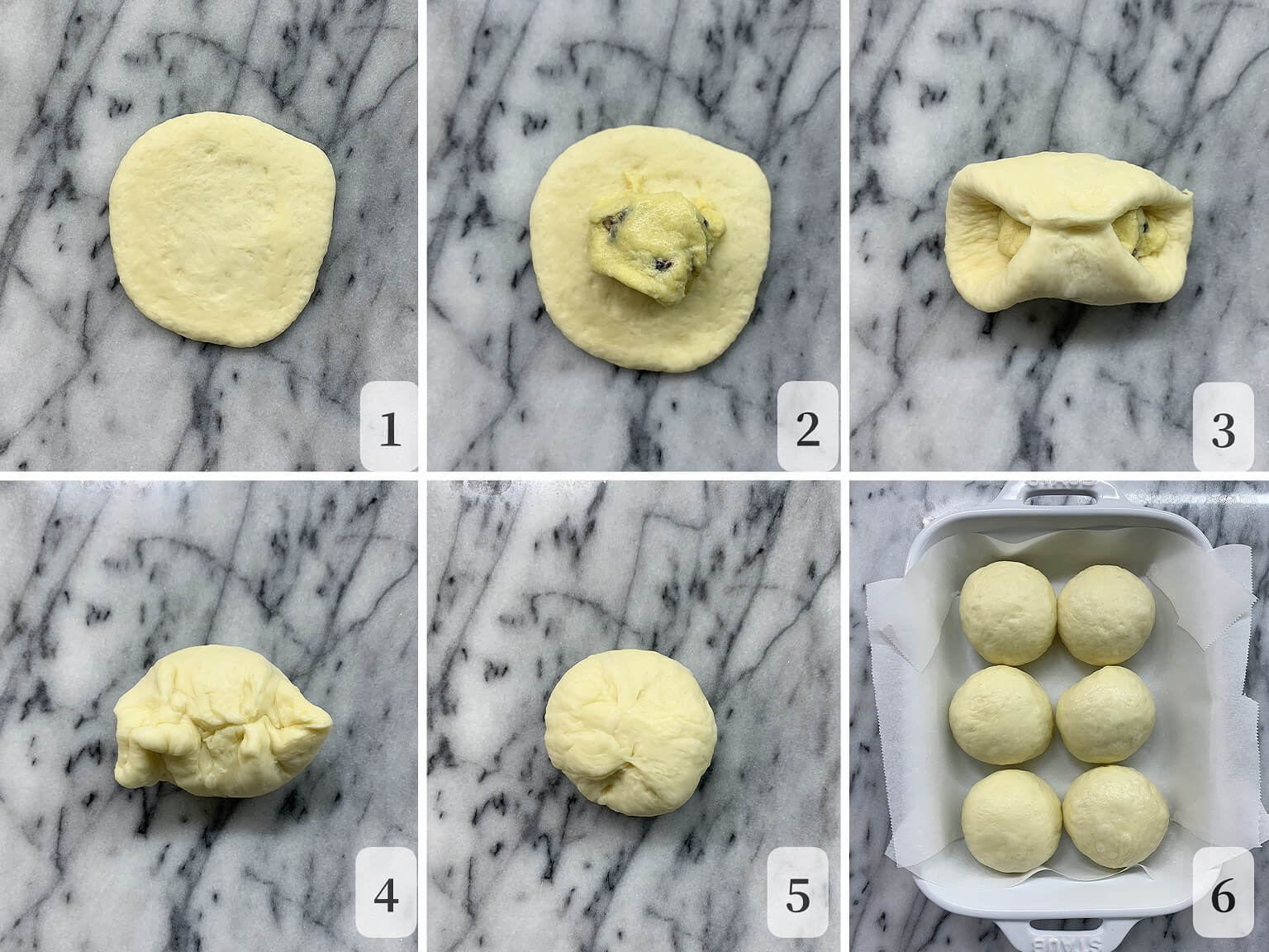 - 整型 : 輕拍小麵團排出空氣,稍微拍平,每個奶酥麵糰包入20g左右的奶酥內餡後,把底部收口捏緊,整成圓形。每個起司麵糰包入1-1片半的起司片,起司片要壓扁或是捏成圓球型,比較好包進麵糰裡。