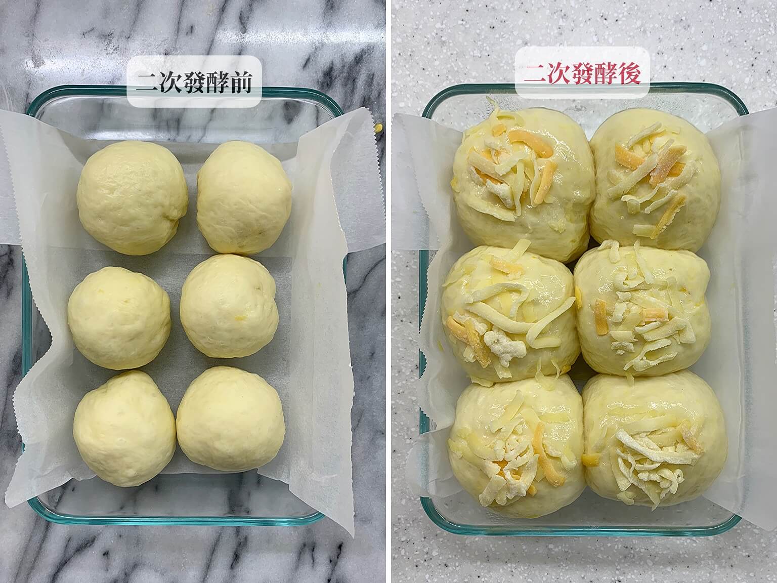 - 第二次發酵 : 把做好的小麵糰放進烤模中排好,發酵到2倍大。在奶酥麵糰面放上堅果片作裝飾,起司麵糰表面刷上蛋液放上乳酪絲。