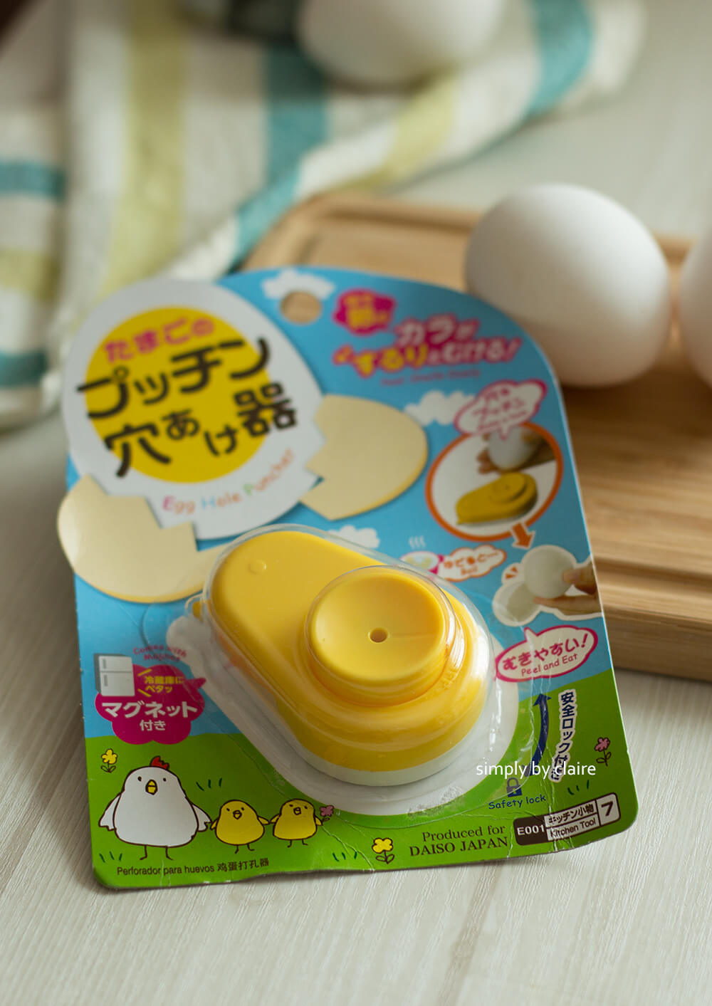 講到好用又貼心的料理工具/小物,日本人認第二就沒別人敢說自己是第一。下圖的這個好用小物,就是蛋殼打洞機,我在大創買的,39元,還可以當磁鐵貼在冰箱上不怕找不到。