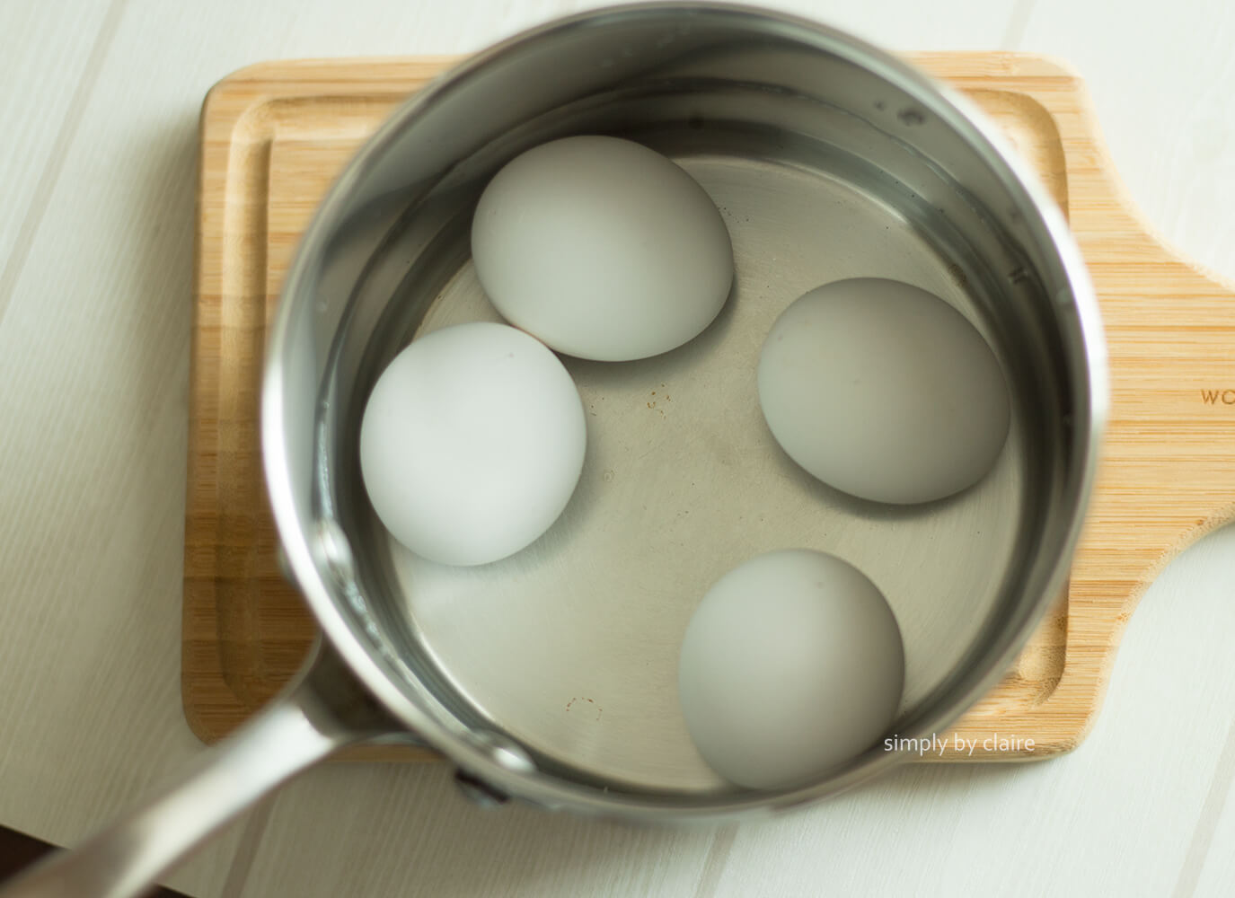 整篇食譜的重點只有一個 : 冷水入鍋,水煮開後關火,蓋上鍋蓋後,才開始計算蛋在浸泡熱水裡的時間。所以我的小標不是寫煮半熟蛋所需的時間,而是製作半熟蛋所需的時間。