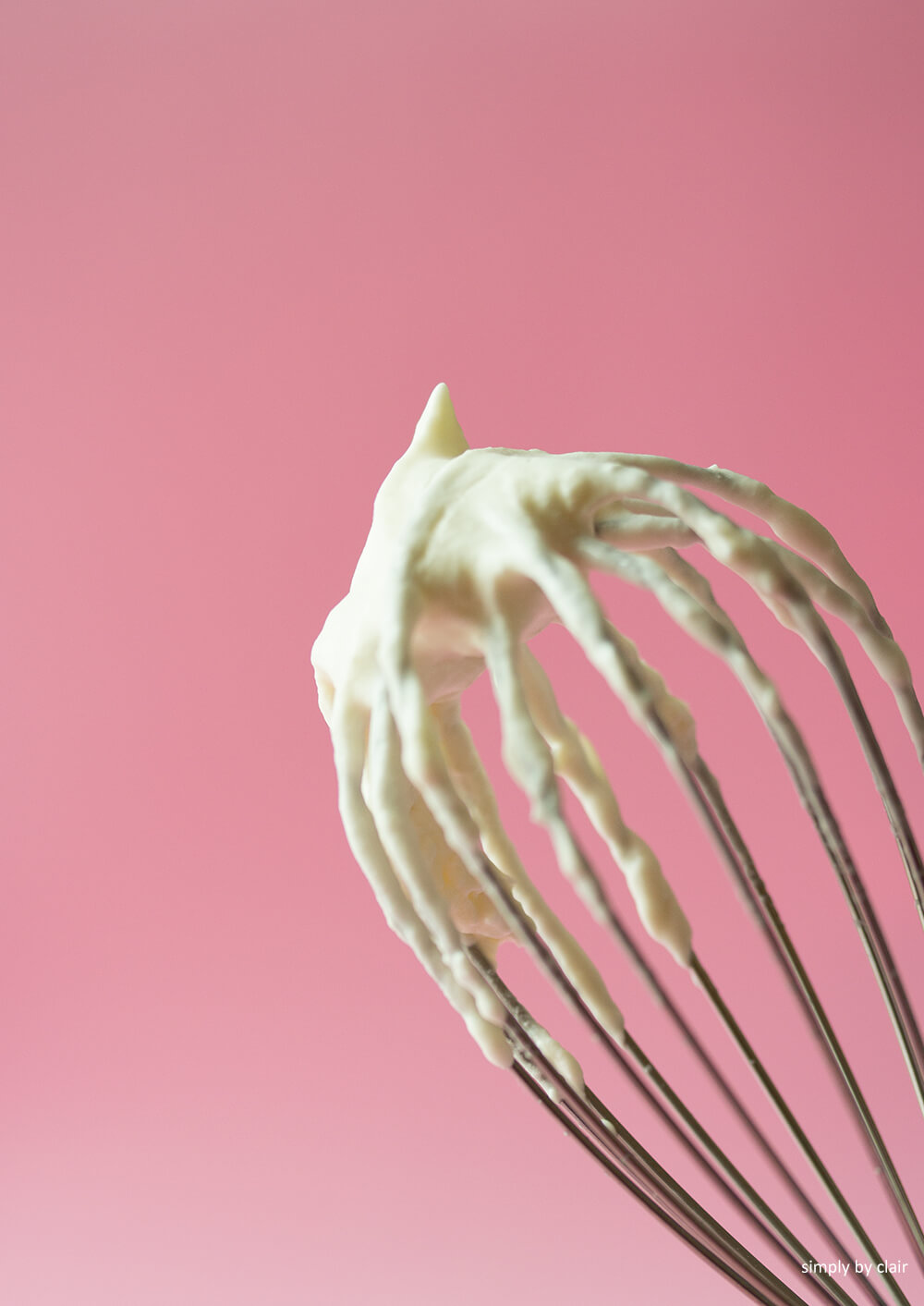 1. 鮮奶油必須確實打發至挺立,拉起來會呈現尖角的程度。