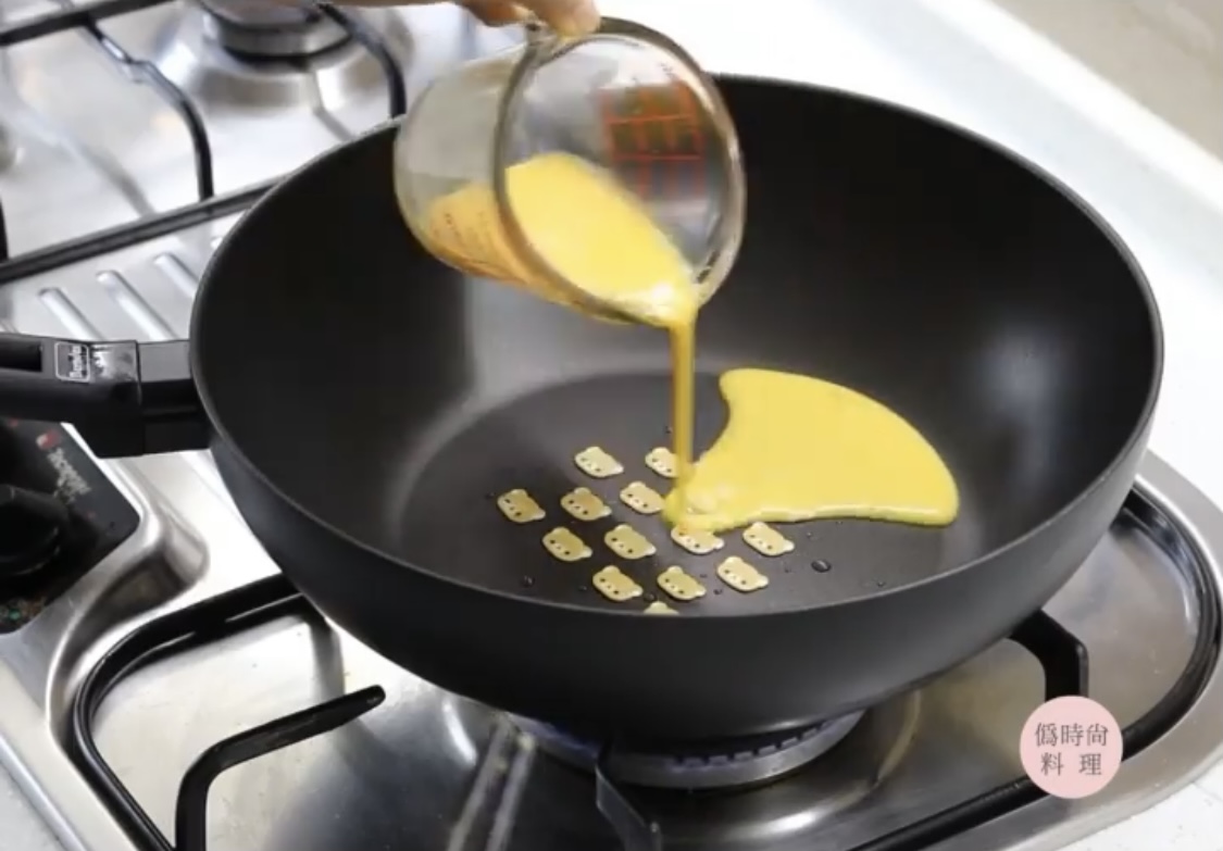 - 泡好的魚板的正面朝鍋底,貼在平底鍋上,然後緩慢的把蛋液加到鍋裡,薄薄的一層不要太厚,用小火慢煮到蛋皮凝固。有大氣泡要戳破。