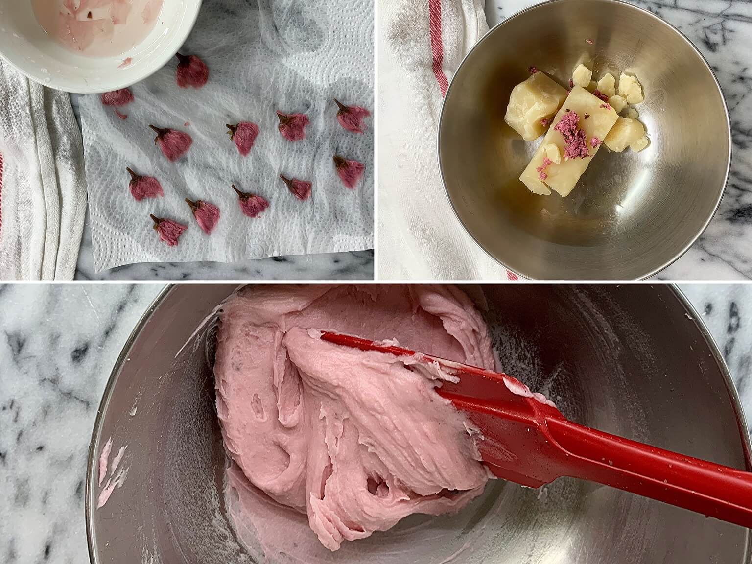 - 製作內餡 : 鹽漬櫻花浸泡熱水15分鐘後,拿起來瀝乾水分,切碎後放進白豆沙裡攪拌均勻,再加入紅麴粉調成喜歡的顏色。