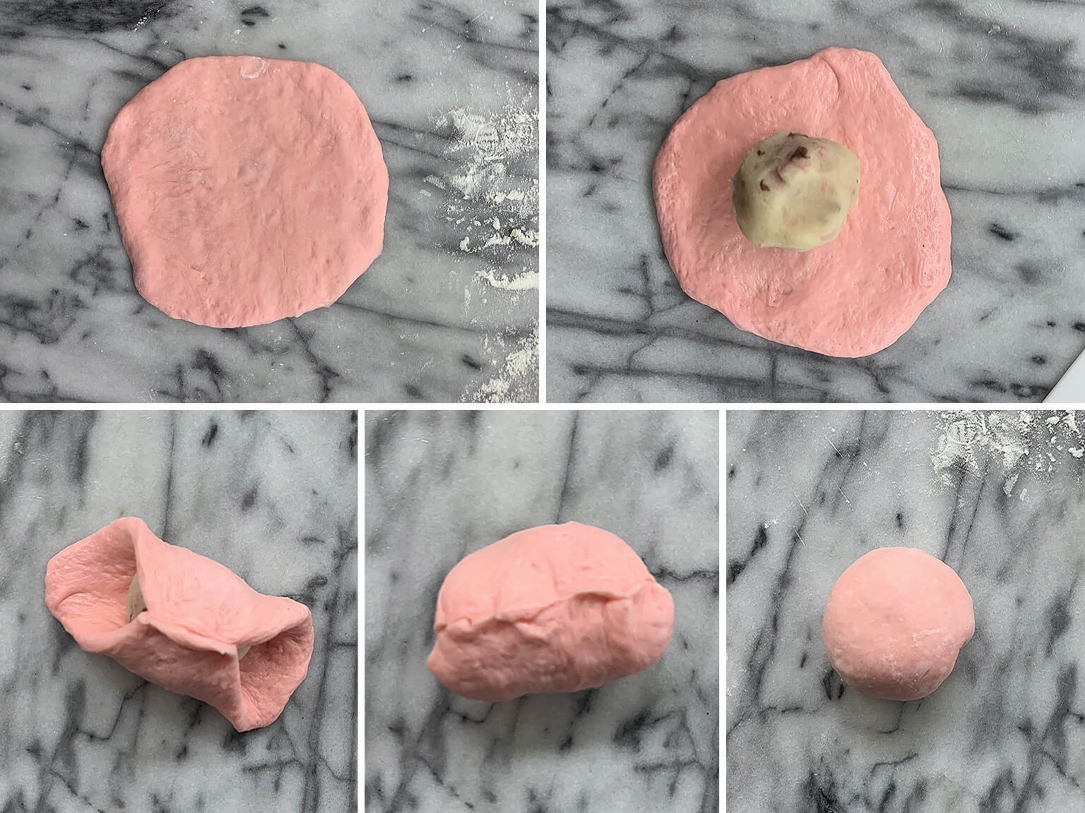 - 整型 : 輕拍小麵團排出空氣,稍微拍平,每個麵糰包入20g左右的櫻花豆沙餡後,把底部收口捏緊,整成圓形。