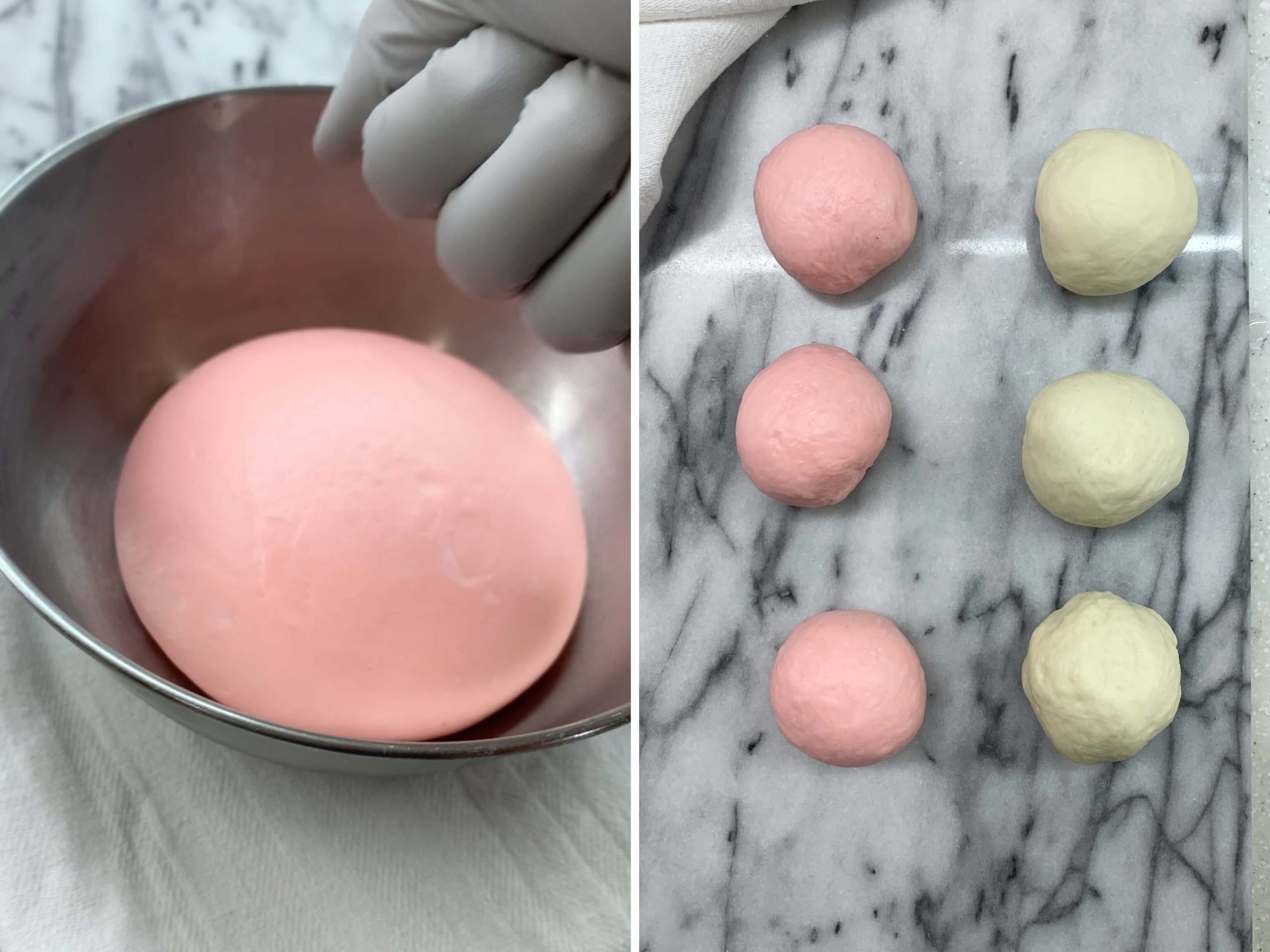 - 鬆弛&分割:從冰箱取出冷藏發酵完成的麵糰,待其稍微回溫,輕拍排出空氣,分切成6等分,我是做雙色所以1個色各是3個,總共6個。每個小麵糰滾圓整成圓球型,蓋上濕布或保鮮膜,靜置鬆弛10分鐘左右。