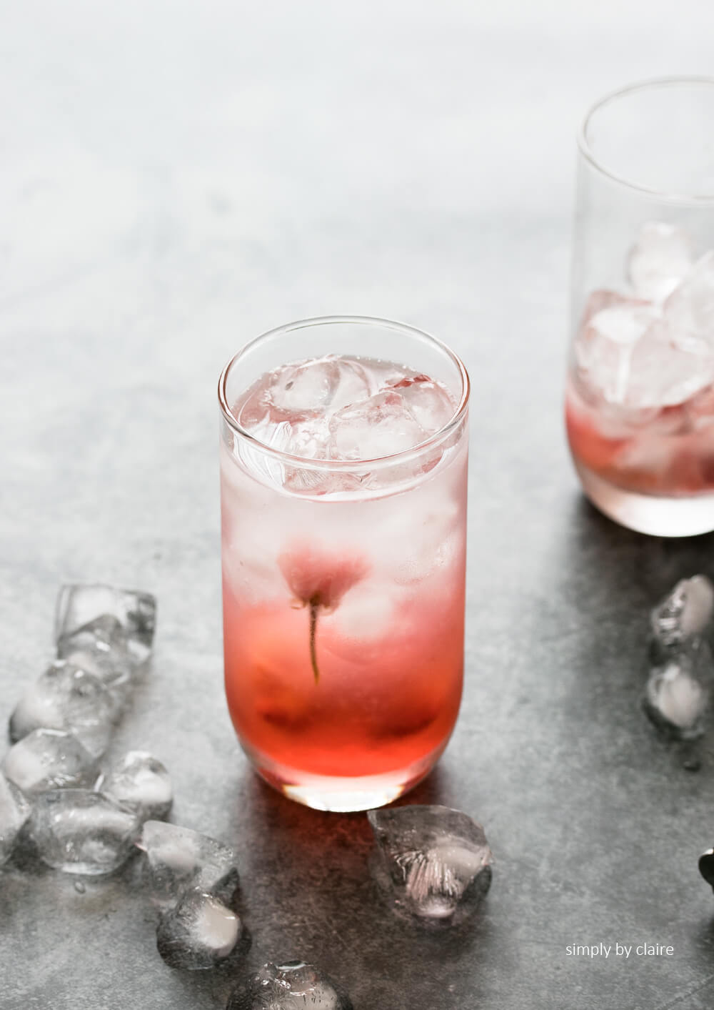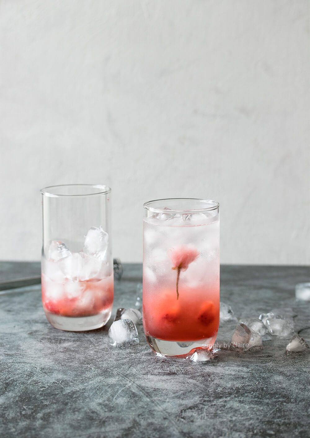 3. 把櫻花糖漿、檸檬汁、草莓粒放進杯底,加進冰塊,再加入飲用水直至接近滿杯。最後輕輕放入鹽漬櫻花使其呈現漂浮杯中的感覺。網美照完成、上傳後趕快喝掉😉。
