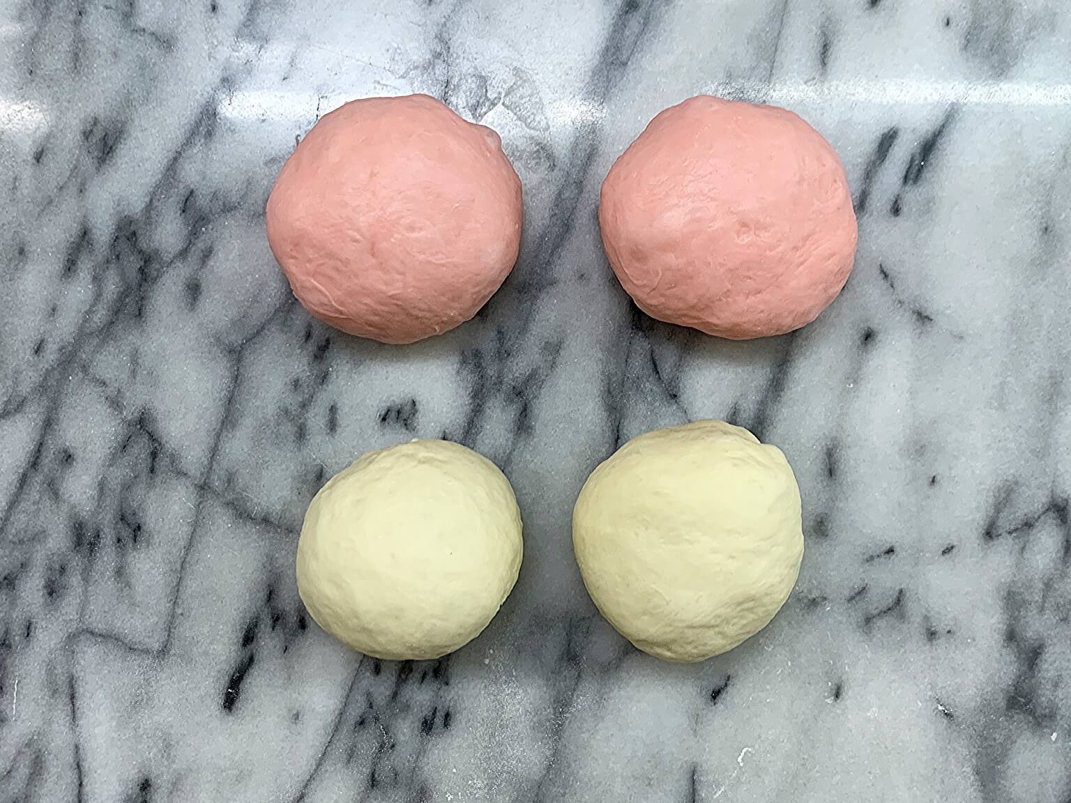- 鬆弛&分割:從冰箱取出冷藏發酵完成的麵糰,待其稍微回溫,輕拍排出空氣,分切成4等分,我是做雙色所以1個色各是2個,總共4個。每個小麵糰約是60g左右,滾圓整成圓球型,蓋上濕布或保鮮膜,靜置鬆弛10分鐘左右。