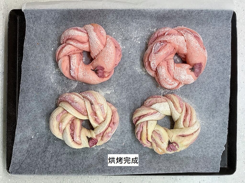 - 整型 : 輕拍小麵團排出空氣,稍微拍平,桿平成20*10公分的長方形麵片,塗上櫻花豆沙餡,捲成長條狀,中間切一刀(不要切到底),交叉擺成麻花的形狀,再圍成圓圈狀。