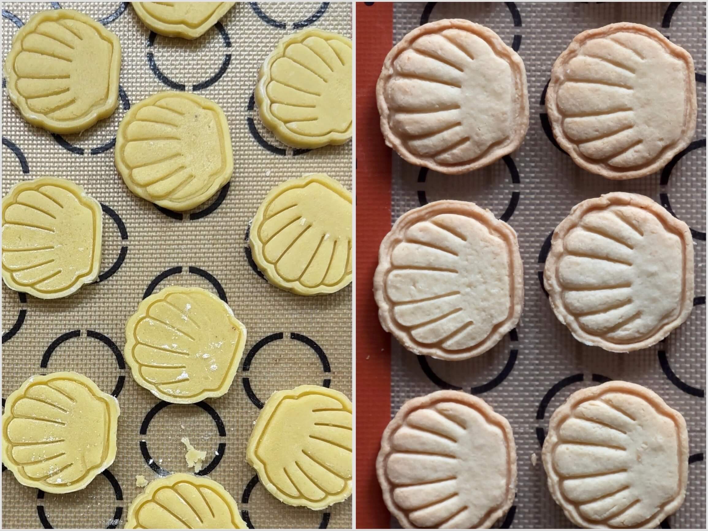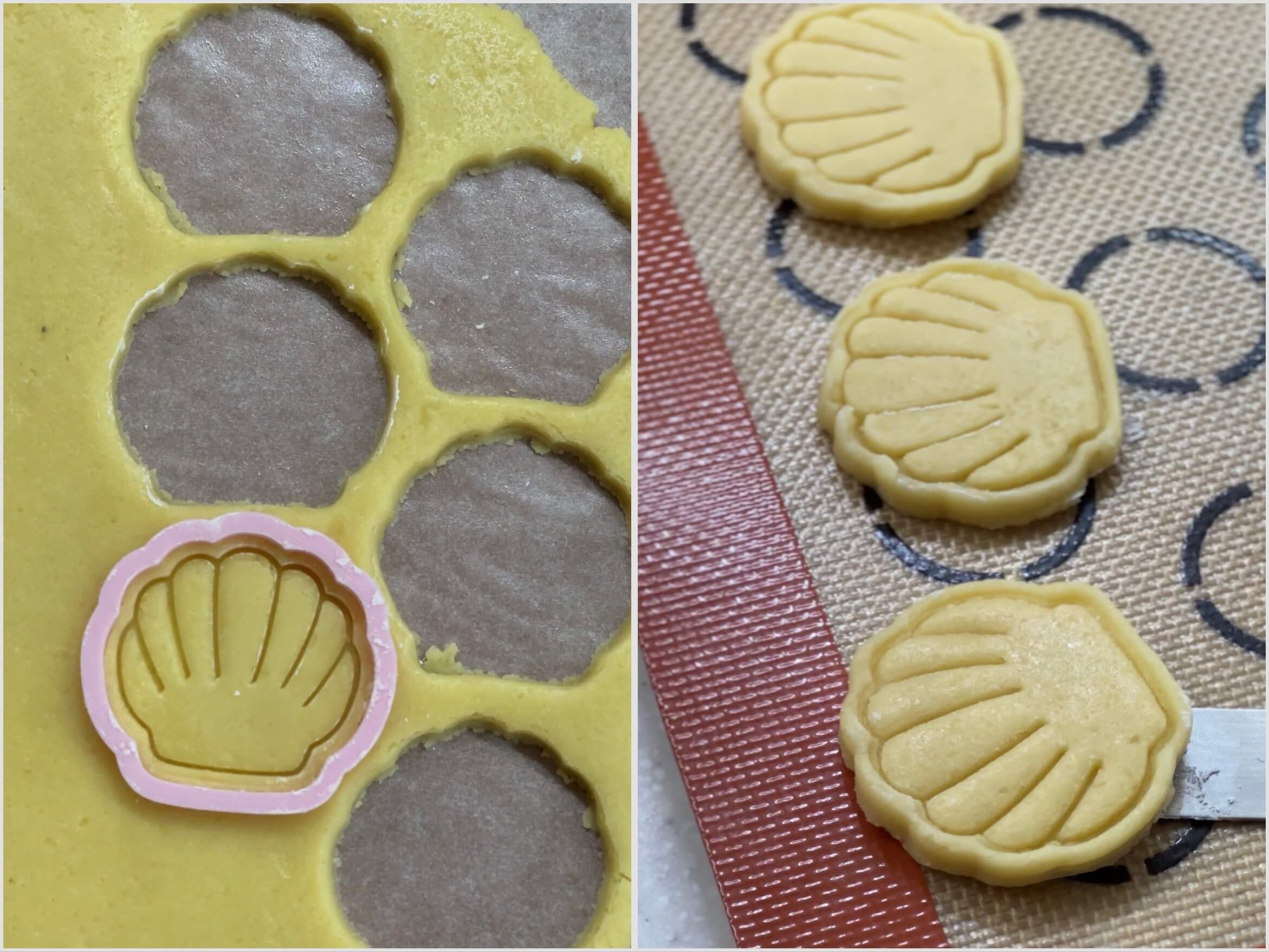 - 組合餅乾 : 確認餅乾有完全冷卻才進行組合的動作,不然夾心餡會化掉。每片餅乾擠上奶油夾心內餡,蓋上餅乾,放上白色珍珠糖,一組貝殼夾心餅乾就完成了。