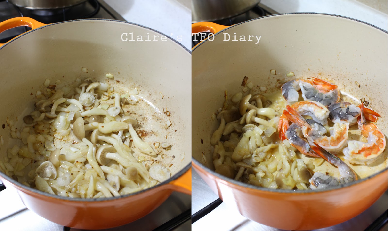 3. 承2,鍋子不必洗,放入洋蔥末炒到變微透明,再放入鴻喜菇炒 (如果覺得剛剛雞翅煎完剩下的油不夠,可視情況再加油)。把鴻喜菇跟洋蔥撥到鍋子的一邊,再放進蝦子,煎熟後呈起備用。