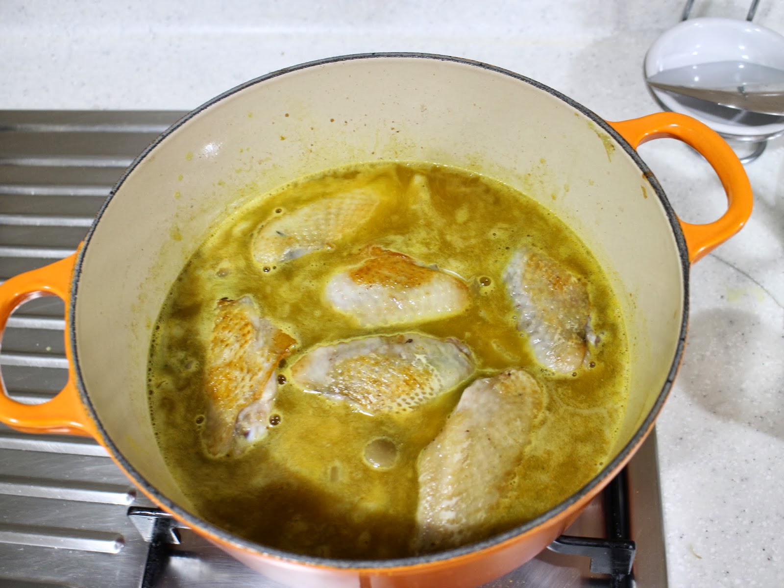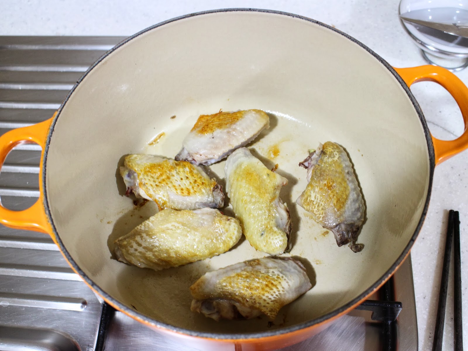 2. LC鍋預熱,不放油用小火乾煎雞翅,煎到兩面都呈金黃色後呈起備用。