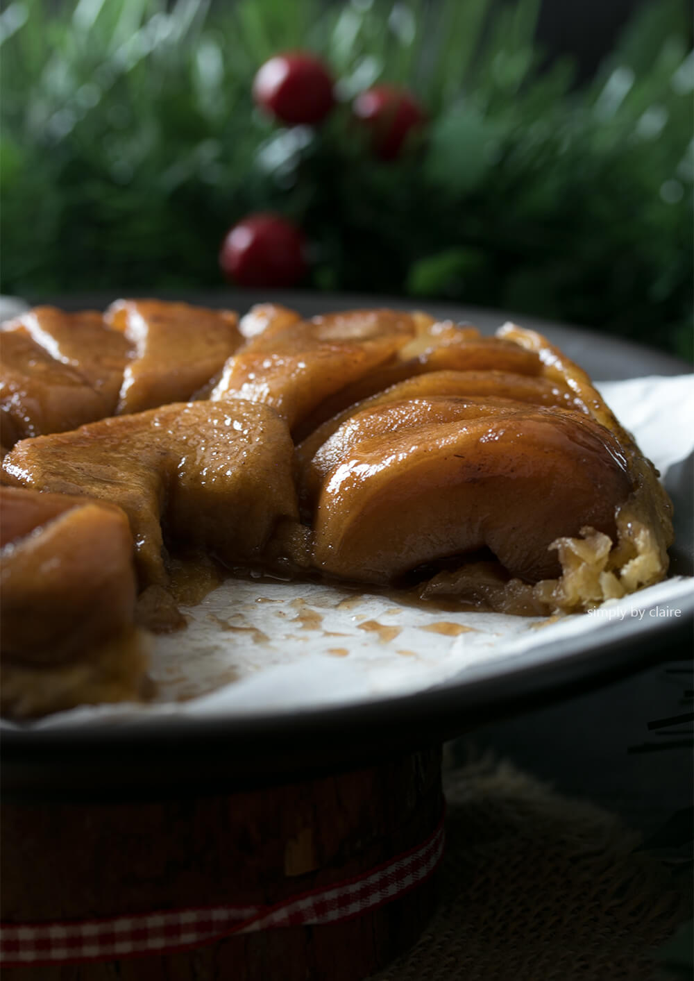 8. 烤好的翻轉蘋果塔,如果是馬上要吃,等微溫的時候就可以先倒扣,如果完全變涼的話,因為這個食譜汁液很少,變涼蘋果會黏住下不來。如果是隔天要吃,先不要倒扣,放在冰箱冷藏,隔天連同鑄鐵盤稍微加熱一下,讓周圍軟化後再倒扣取出。