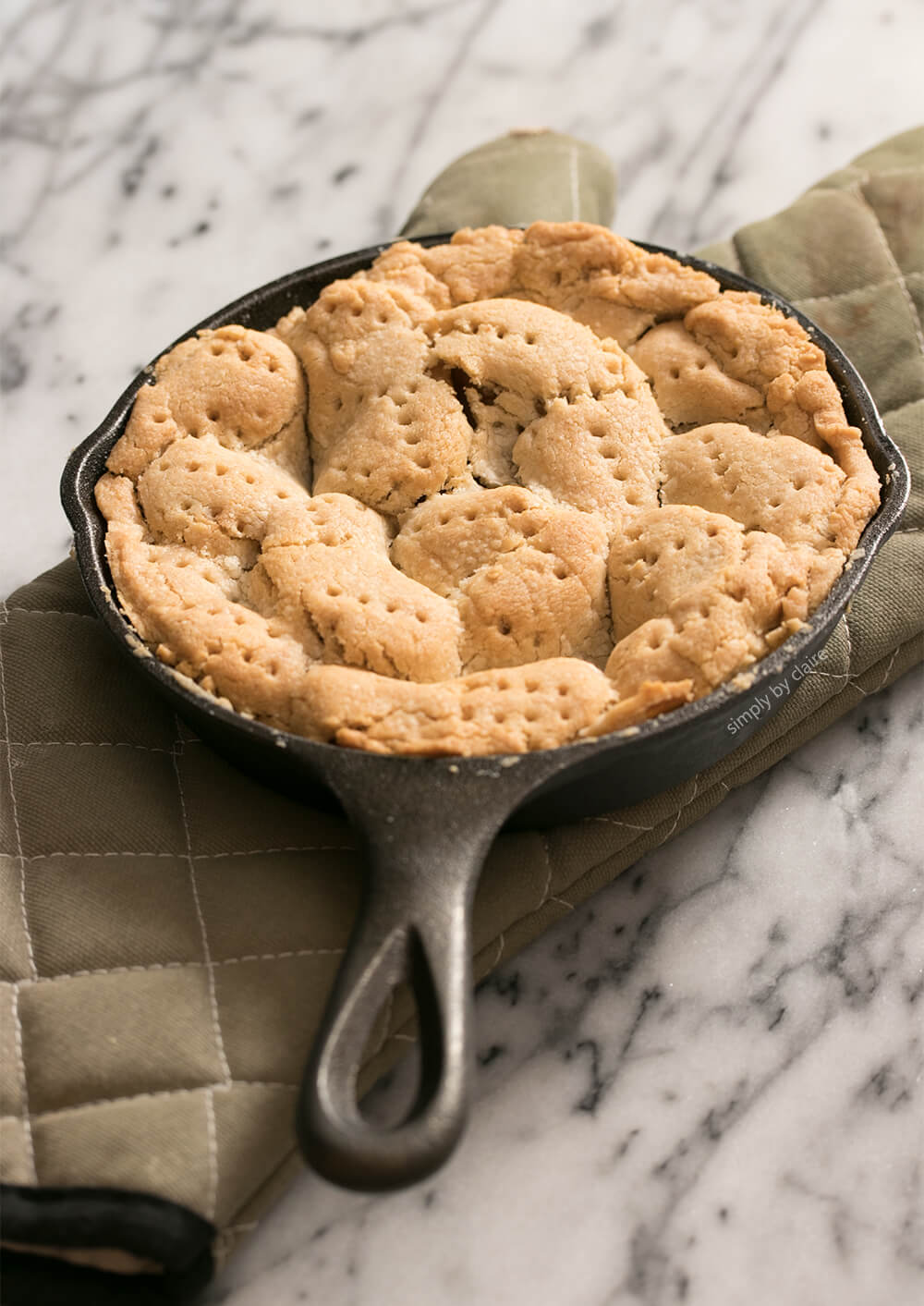 7. 蘋果片重新排入烤模 : 把步驟4煮好的焦糖醬倒進鑄鐵盤,但只要能蓋住底部即可,不一定要全部倒進去。接著把蘋果片排進鑄鐵盤中,一定要排非常緊密,塞好塞滿,再蓋上派皮,多餘派皮用叉子摺入烤模中,並在派皮上戳洞,送進烤箱,以190度烤15-20分鐘直到上色。