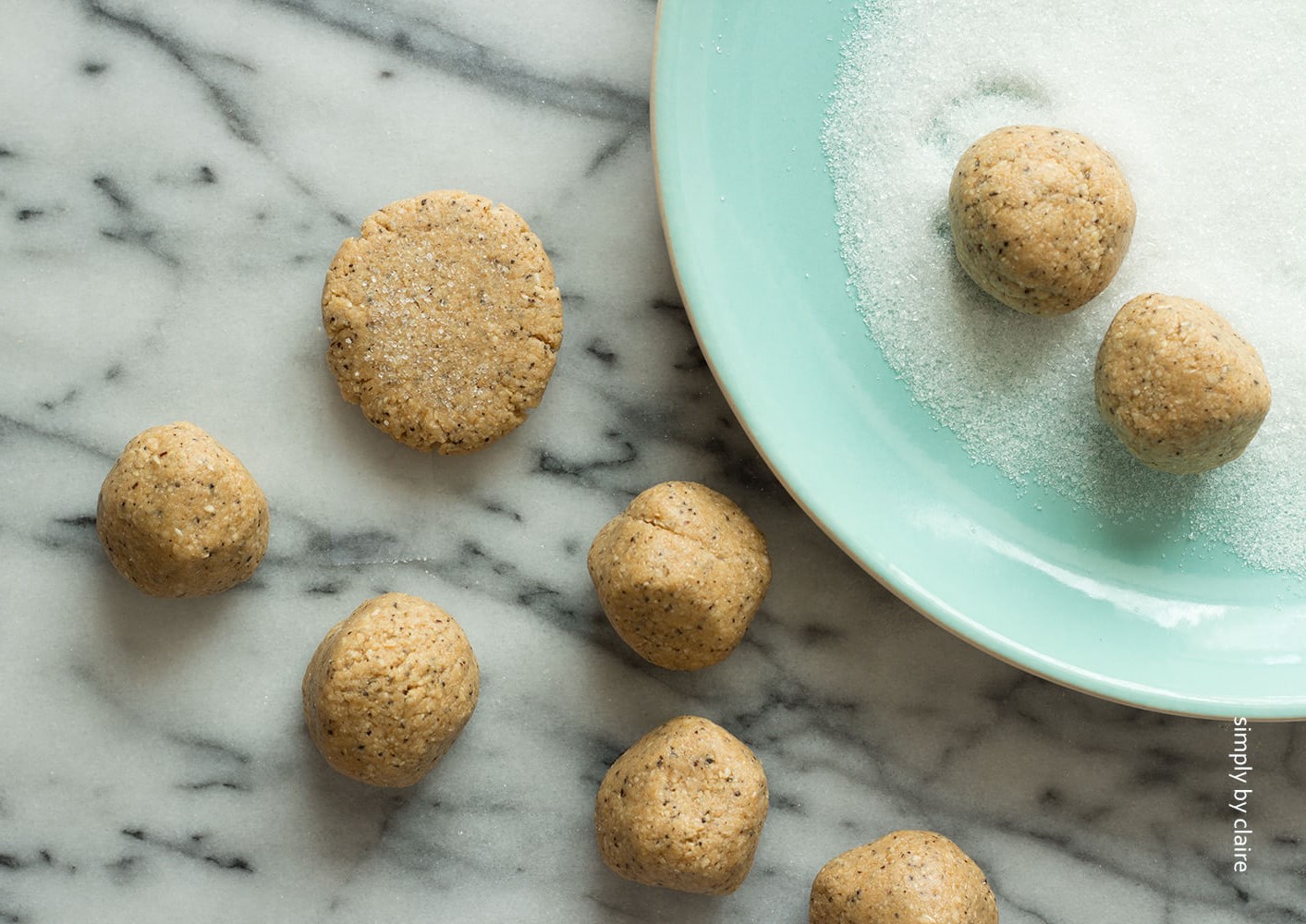 餅乾表面的砂糖,我是用比較粗的二砂糖而不是用糖粉,若做成小一點的球狀、再沾上糖粉,就會像雪球餅乾,如這個抹茶雪球餅乾。
