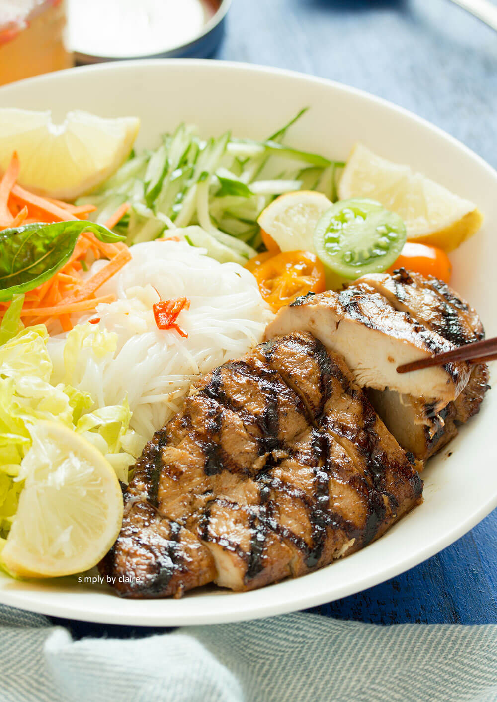 只是雞肉醃料是參考delish的這個 – 夏威夷風的烤雞食譜 (但沒加鳳梨汁🍍所以不算夏威夷風吧?),因為我老早在冰箱存放好些醃雞肉等待不時之需,就直接拿來配了沒有所以照Recipe Tin eats的食譜來醃雞肉。用夏威夷烤雞+越式米粉,這可是fusion cuisine呢 (欸不是混搭就是fusion cuisine好嗎)~