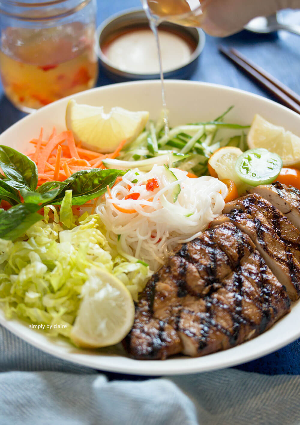 6.製作沙拉 : 將烤好的雞肉切片,把米粉、各種蔬菜依次堆於盤中,最後放上雞肉片,淋上越式酸甜醬汁,即可食用。